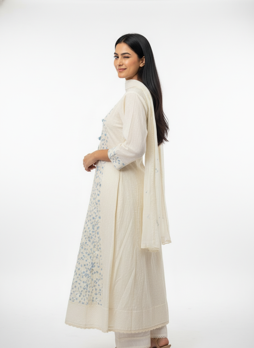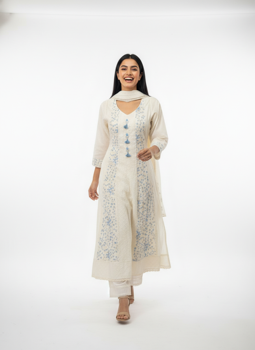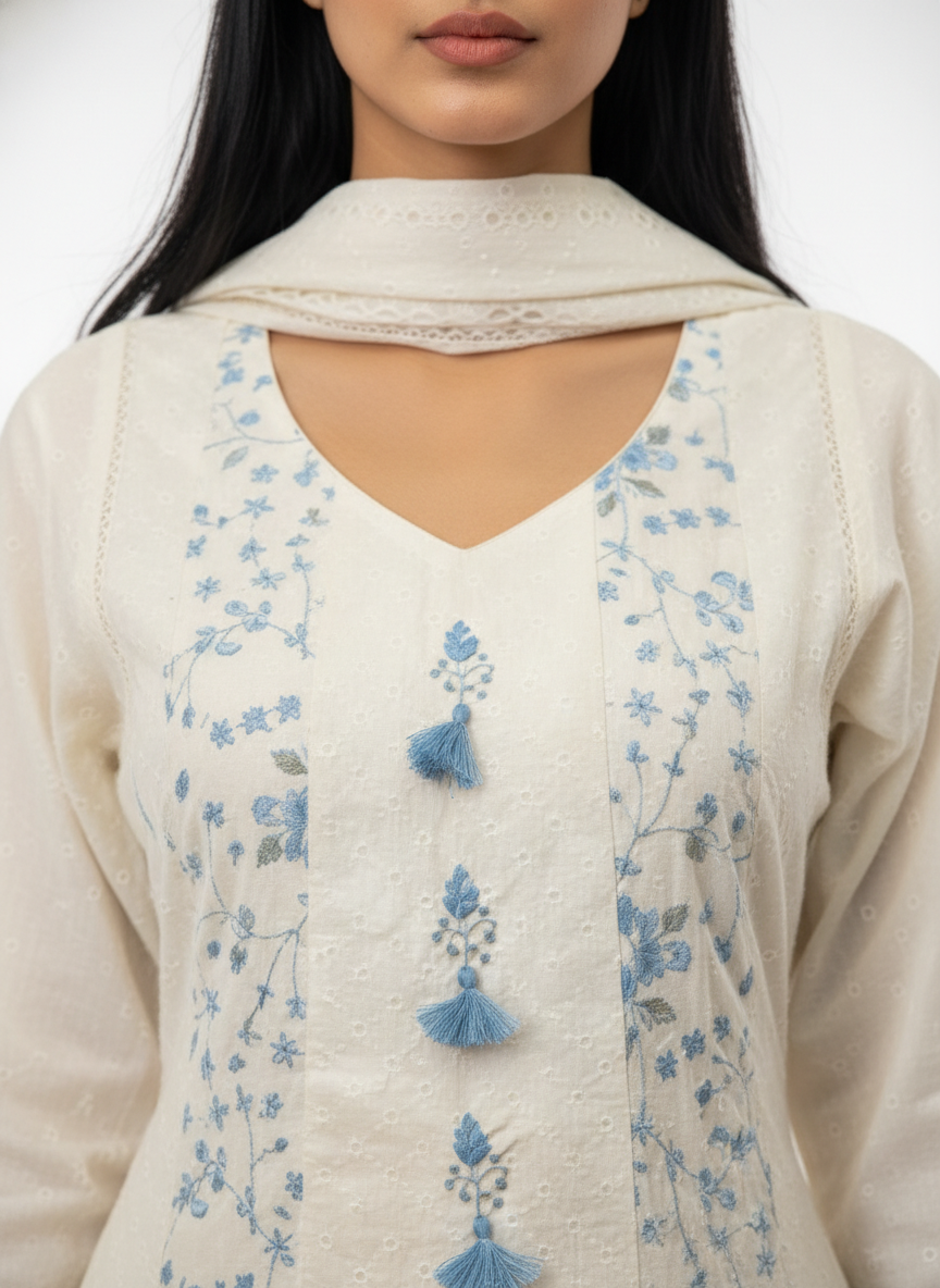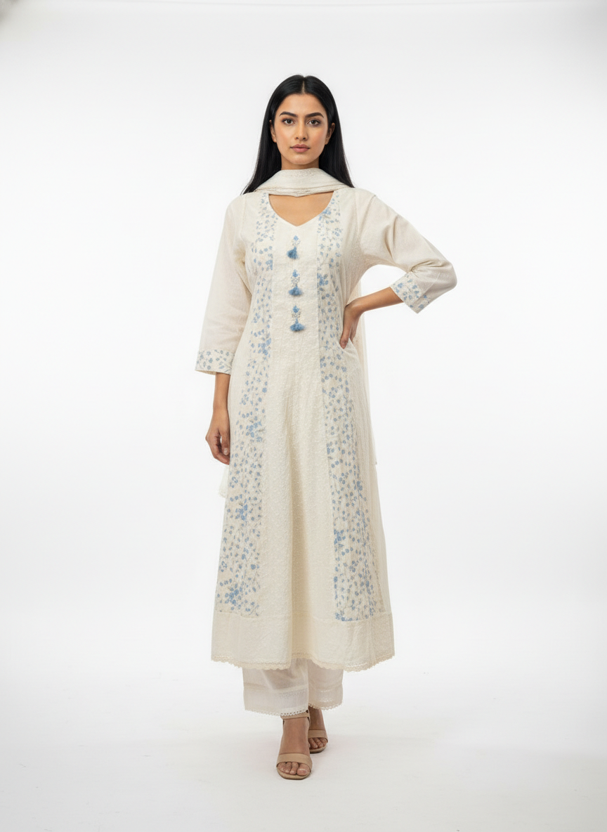 Elegant cream cotton kurta set featuring delicate blue floral embroidery, tassel detailing on the neckline, three-quarter sleeves, and a soft matching dupatta. Perfect for festive gatherings, office wear, and daytime celebrations.