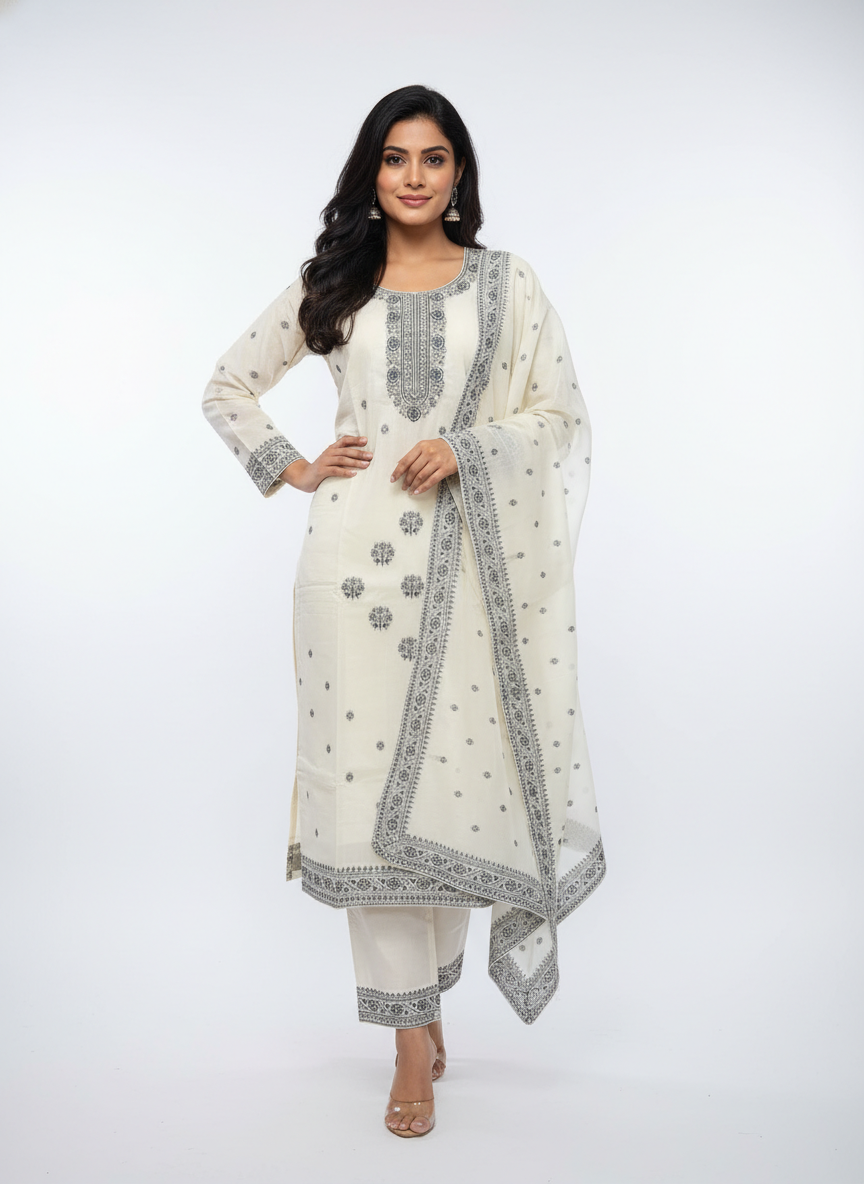 This ivory kurta set is ideal for women who prefer subtle colours, clean designs, and versatile ethnic wear. Pair it with silver jhumkas, minimal makeup, and classic footwear for a graceful daytime look, or dress it up with statement accessories for festive charm. A timeless addition to your wardrobe, this kurta set effortlessly blends tradition, comfort, and modern elegance.