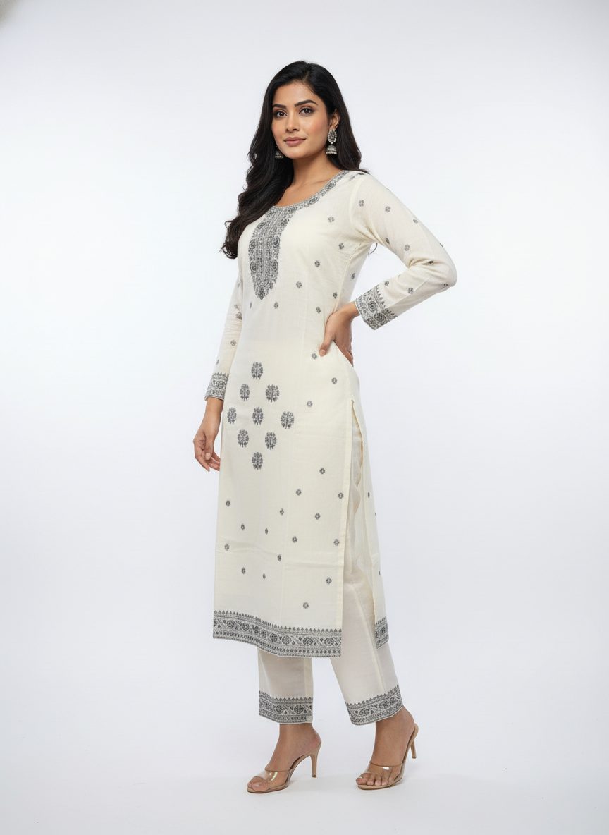 Elevate your ethnic wardrobe with this elegant ivory white printed kurta set, thoughtfully designed for women who appreciate timeless style with everyday comfort. This beautifully crafted kurta showcases delicate grey motifs inspired by traditional block prints, lending it a graceful and refined aesthetic. The subtle embroidery-style detailing around the neckline adds depth and sophistication, making the outfit look polished without being overly ornate.