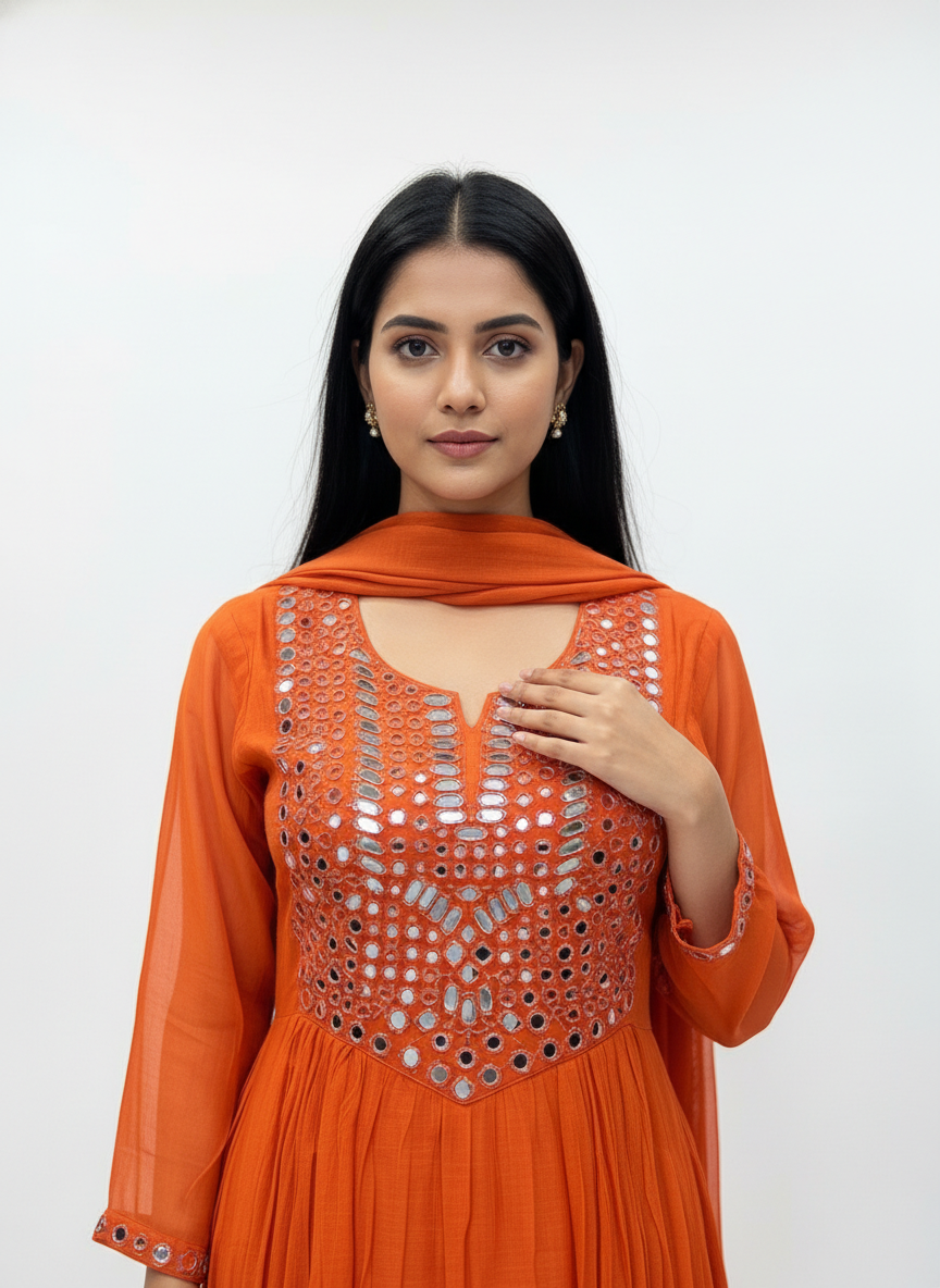 Step into timeless elegance with this beautifully crafted Orange Mirror Work Anarkali Kurta Set for Women, designed to add charm and sophistication to your festive wardrobe. The vibrant orange hue symbolizes warmth, celebration, and grace—making it a perfect choice for weddings, festive gatherings, and traditional functions.