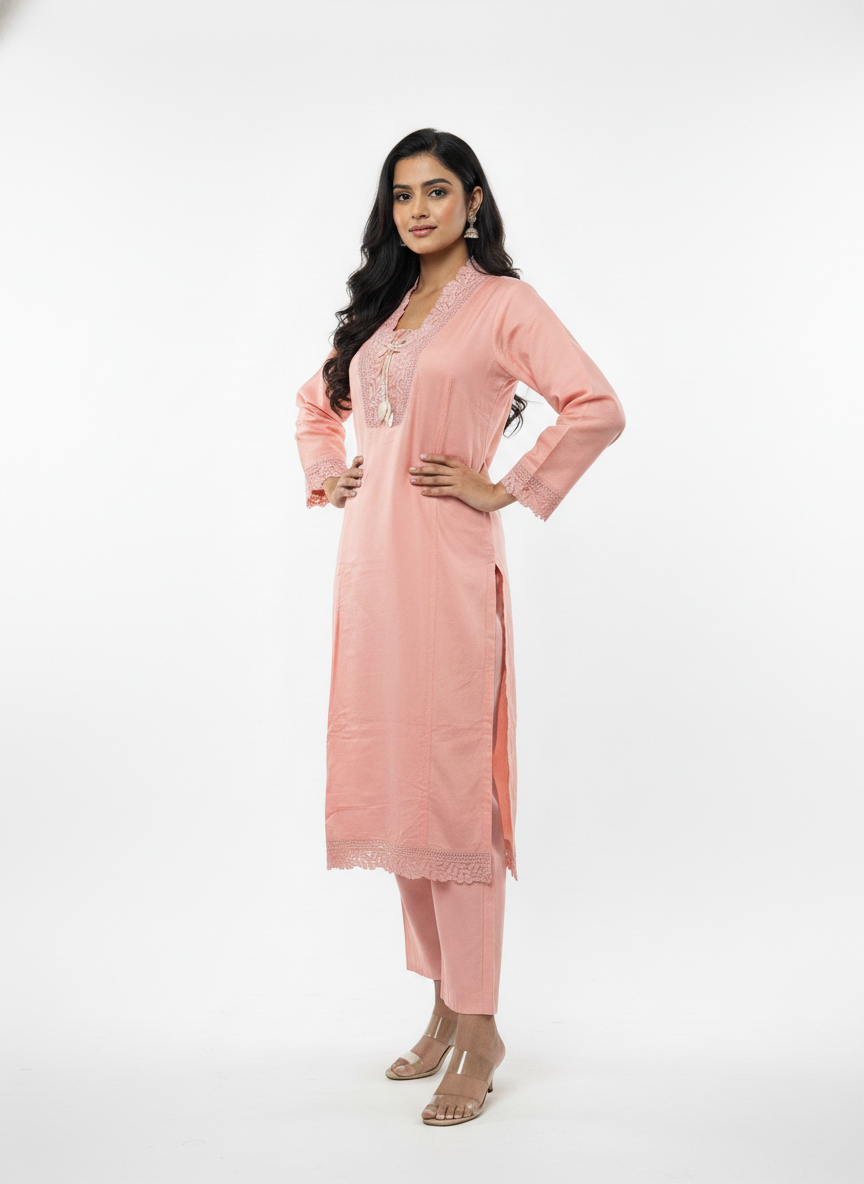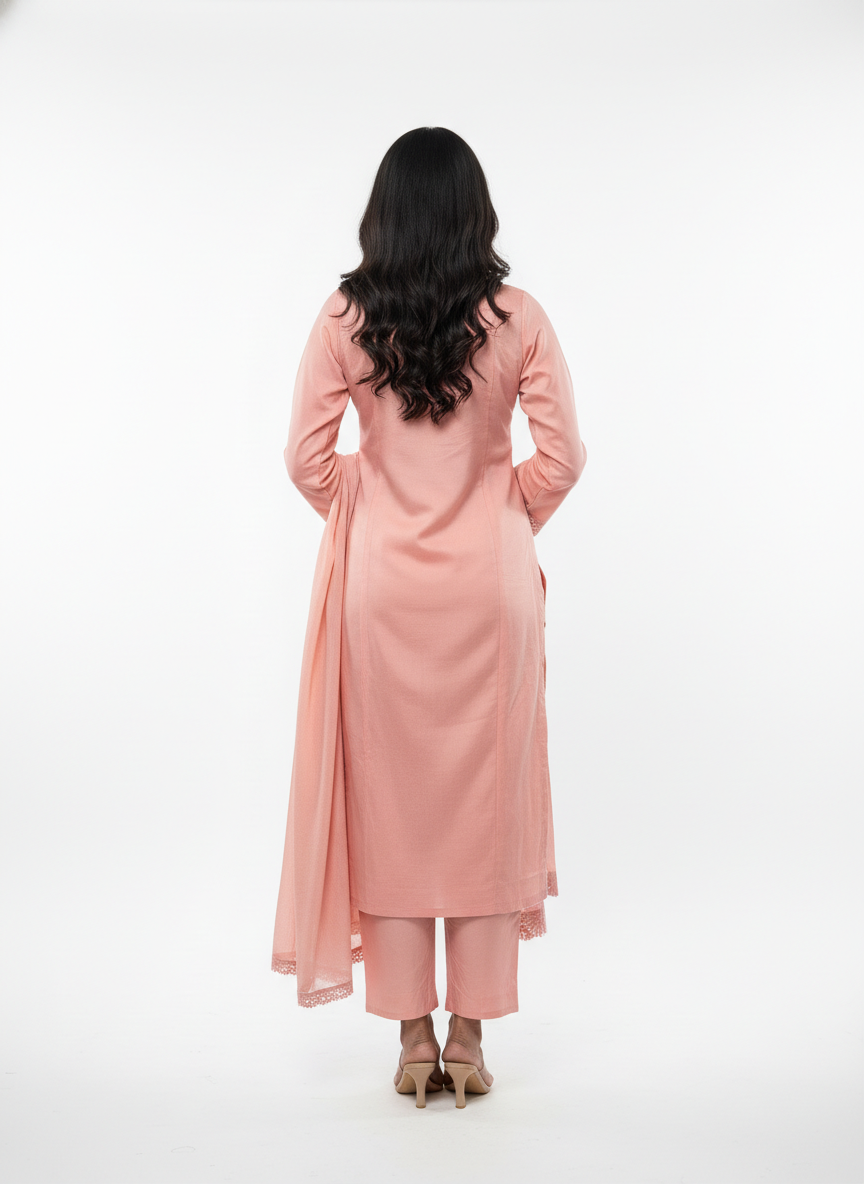 The straight-fit kurta is paired with comfortable matching pants and a sheer dupatta, making it ideal for festive gatherings, family functions, office wear, and casual ethnic outings. The soothing peach tone complements all skin tones and makes it a versatile choice for both day and evening wear.