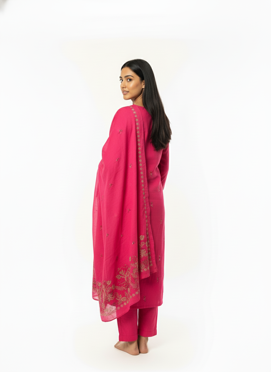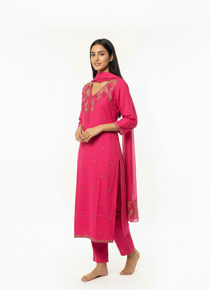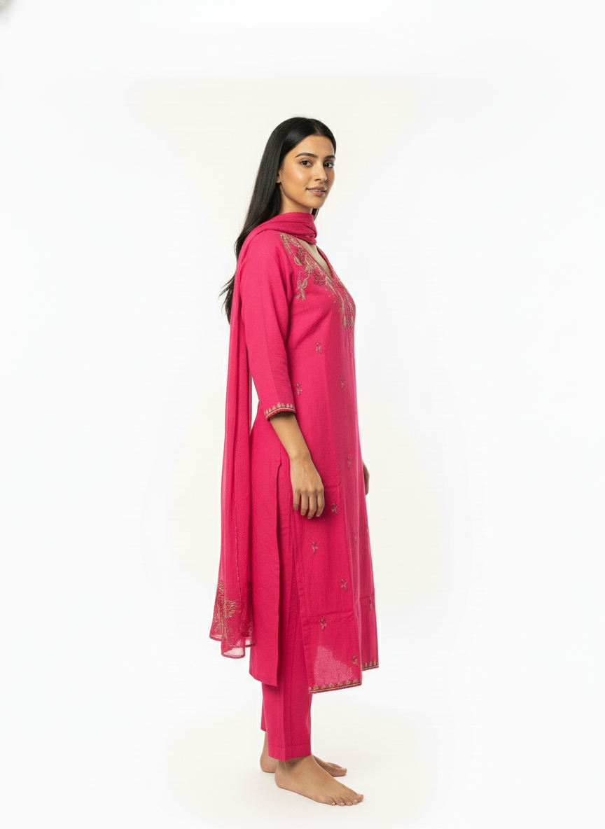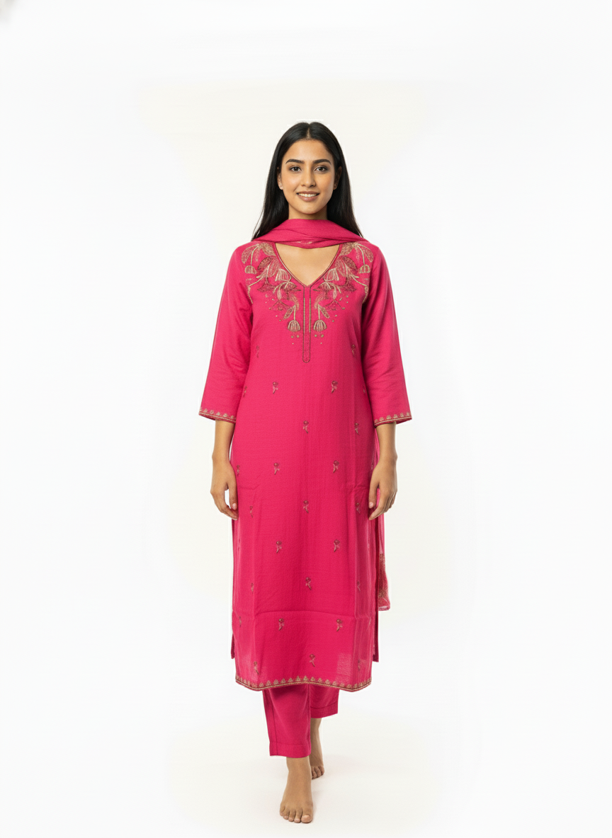 This pink embroidered kurta set brings together graceful design and everyday comfort in a timeless silhouette. Featuring delicate embroidery around the neckline and subtle motifs across the kurta, the set is paired with matching bottoms and a coordinated dupatta for a balanced ethnic look. Ideal for festive occasions, casual celebrations, and elegant day wear, this outfit is designed for women who prefer refined style without excessive embellishment.
