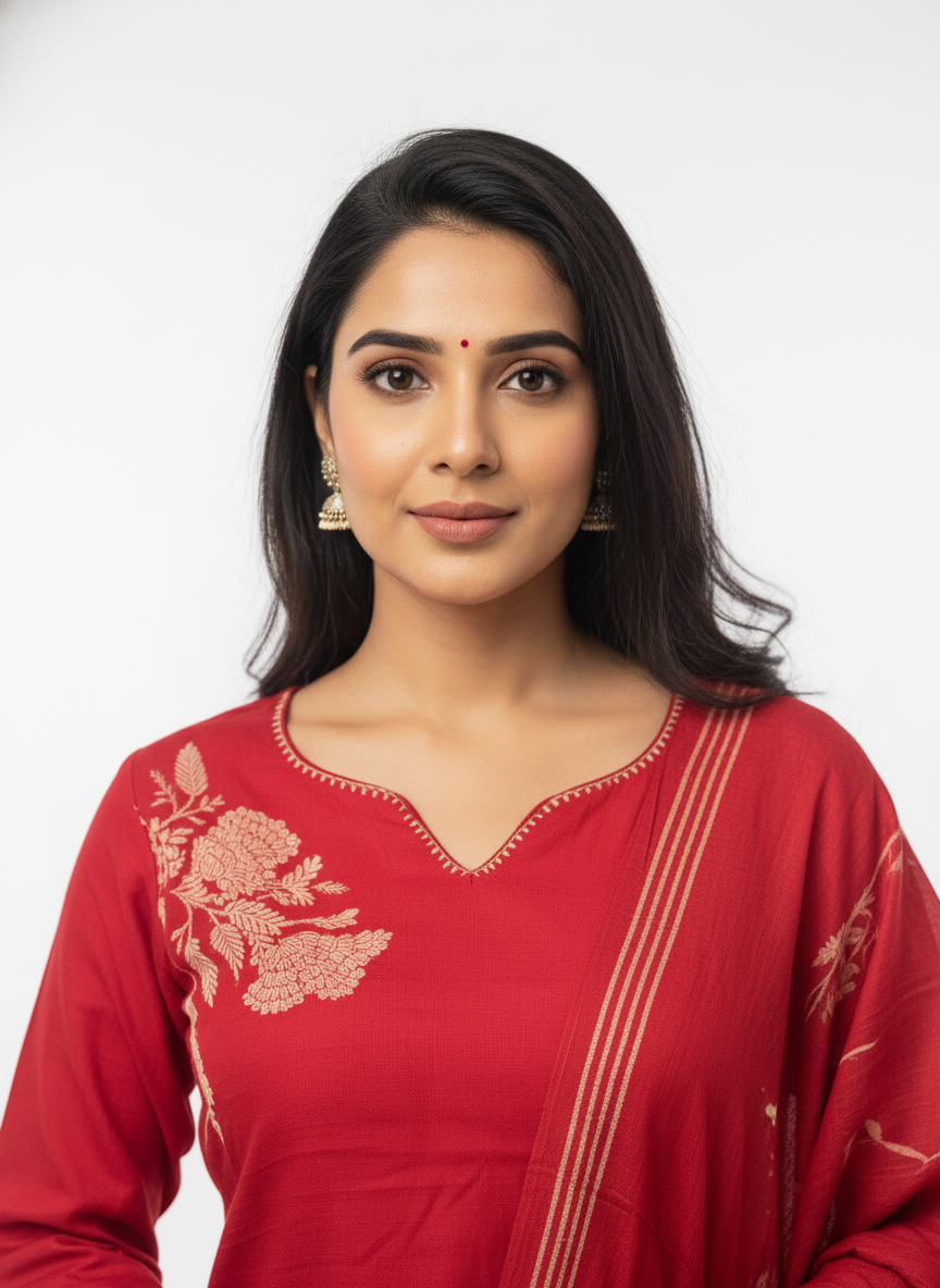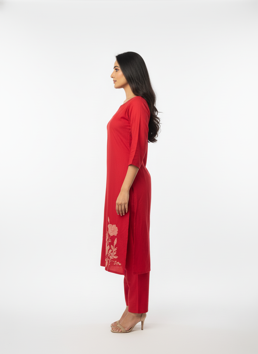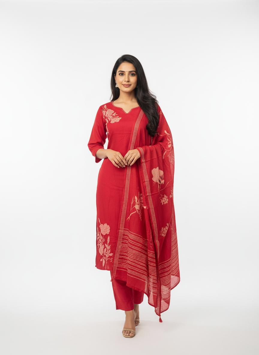 The straight-fit kurta is paired with matching red pants that offer a comfortable silhouette suitable for long hours of wear. Complementing the set is a lightweight dupatta featuring floral patterns and fine border detailing, adding depth and softness to the overall outfit. The dupatta drapes effortlessly, making it ideal for both formal and semi-formal ethnic occasions.