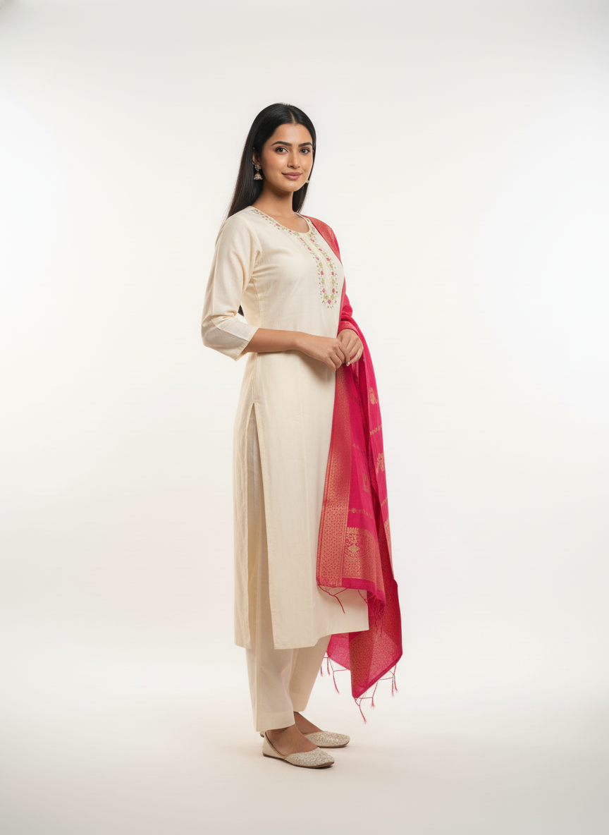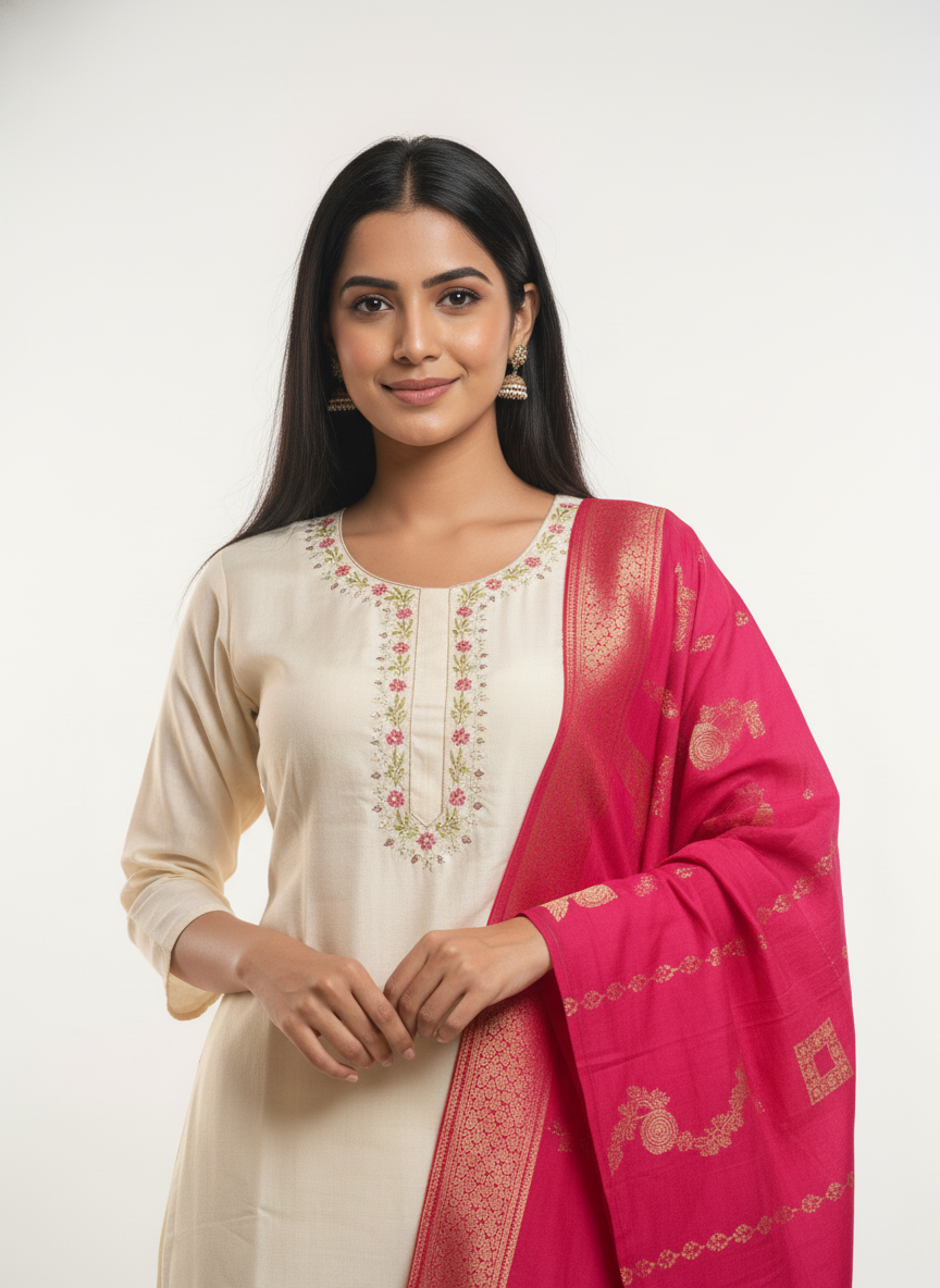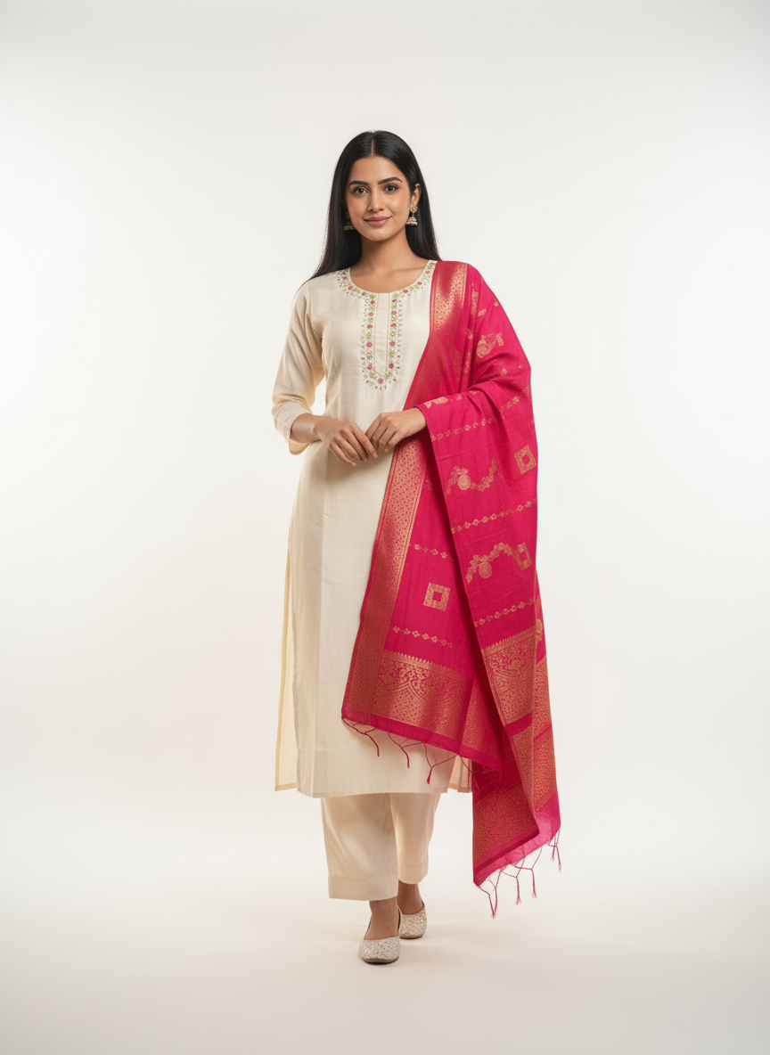 Complementing the kurta is a beautifully woven Banarasi dupatta, adding a traditional contrast with its rich weave and classic appeal. The dupatta instantly transforms the outfit into a festive-ready ensemble while maintaining balance and sophistication.