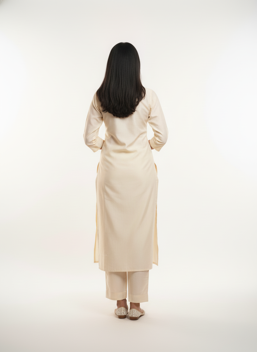The highlight of this suit lies in its hand embroidery enhanced with fine pearl work, delicately placed to add texture and richness without overpowering the minimalist white base. The straight-cut silhouette ensures a flattering fall, making it suitable for both festive and semi-formal wear.