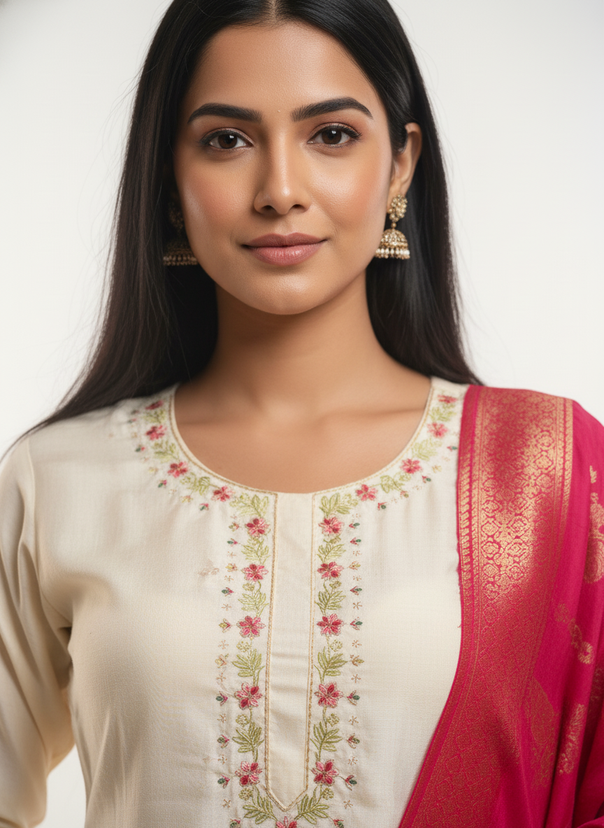 Pair this suit with gold or pearl jhumkas, minimal makeup, and neutral footwear to let the embroidery and Banarasi dupatta do the talking.