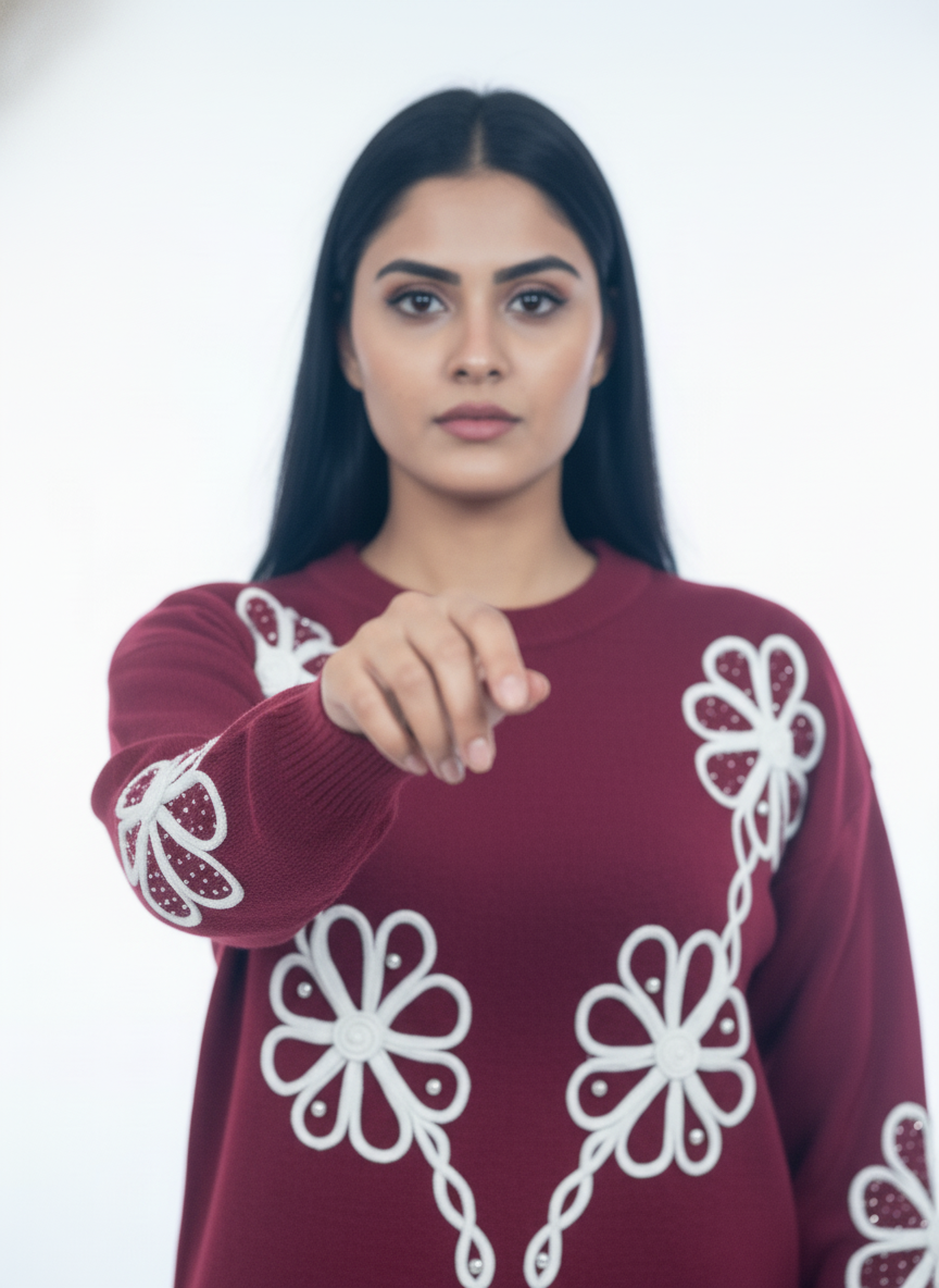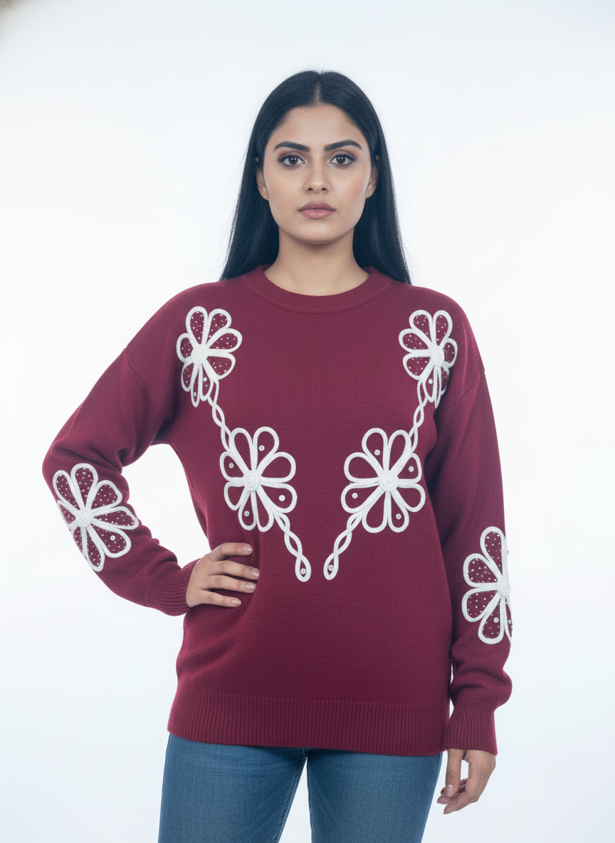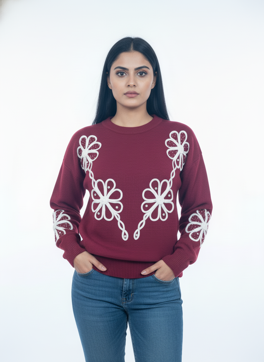 A statement winter sweater crafted in a rich wine hue, featuring elegant white floral hand embroidery. Designed for warmth, comfort, and standout everyday style.