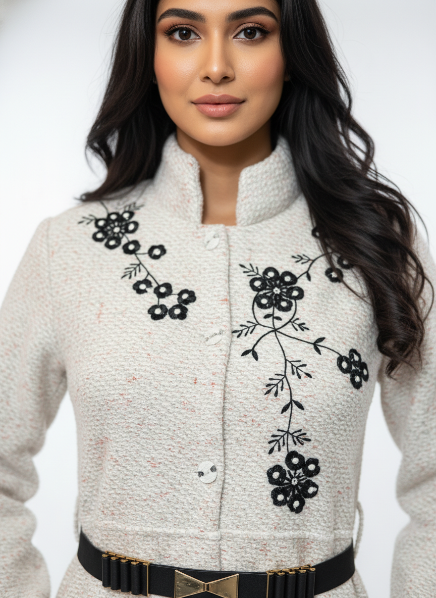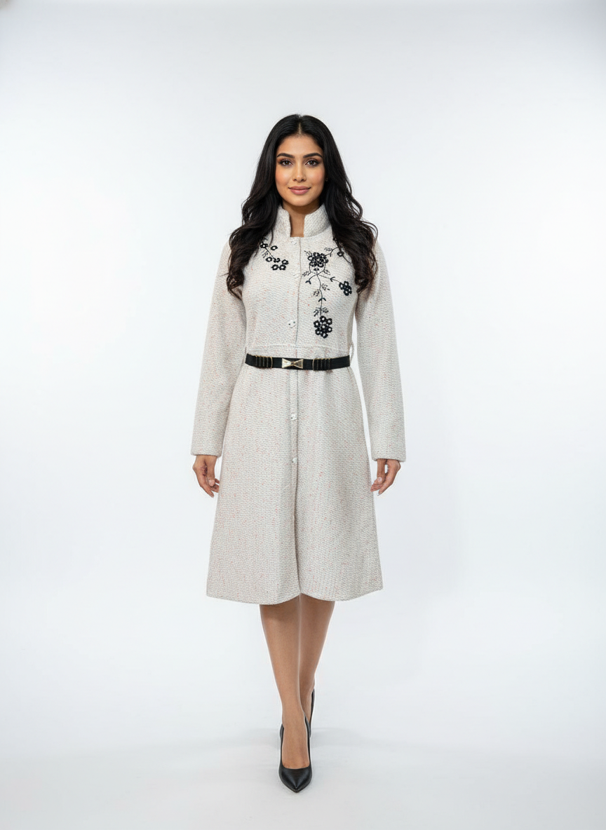 Elegant beige wool-blend long coat featuring delicate black floral embroidery, a structured mandarin collar, and a detachable waist belt. Designed for warmth, sophistication, and a tailored winter look.