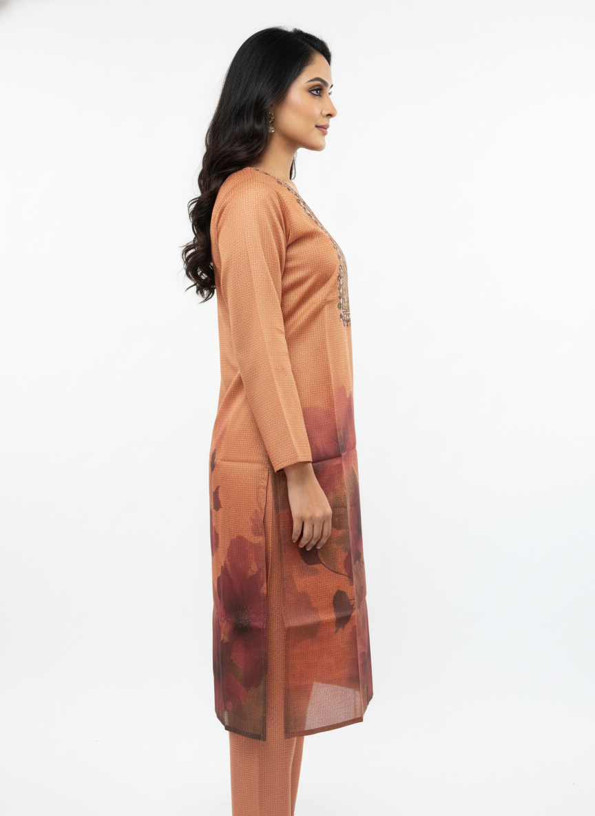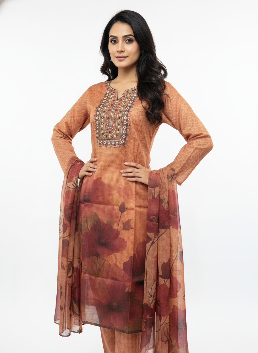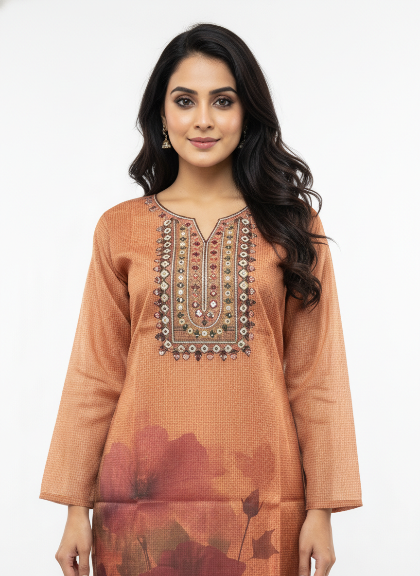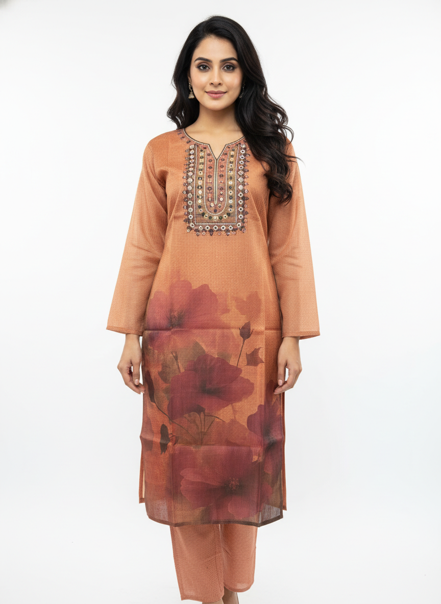 • This elegant peach kurta set is designed for women who prefer understated style with everyday comfort. The straight-fit kurta features a refined neckline with intricate detailing that adds a subtle ethnic charm without appearing heavy or overdone. The soft peach tone is enhanced with delicate floral-inspired prints, making the outfit graceful, feminine, and suitable for multiple occasions.